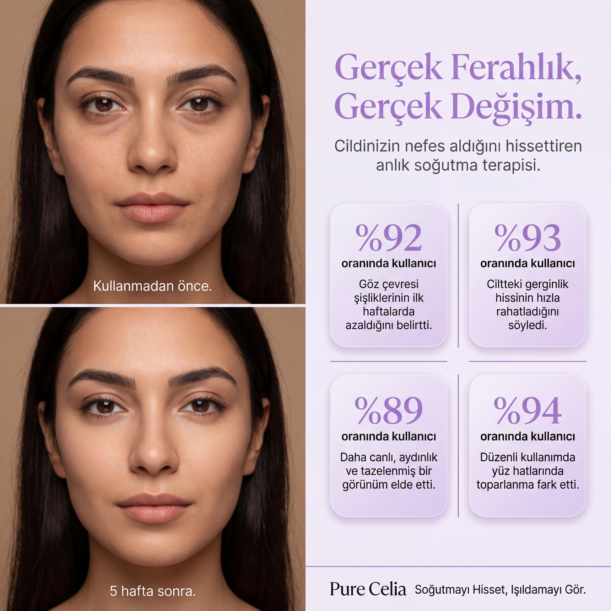 Gün boyu biriken yorgunluk artık sorun değil! PureCelia, özel jel boncuk teknolojisiyle yüzündeki şişkinlik, gerginlik ve stres izlerini saniyeler içinde hafifletir.
